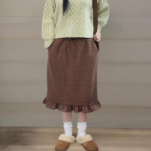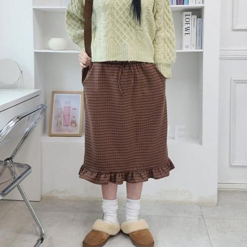 [신상오픈런]여성용 겨울 체크 A라인 프릴 롱스커트 밴딩 스판