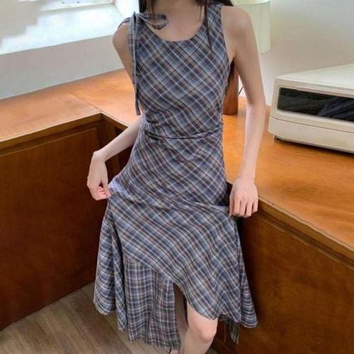 [셀러허브_여성트랜드패션]여성 잔잔 체크 체크패턴원피스 패턴 플레어 언발란스 롱원피스 여성원피스