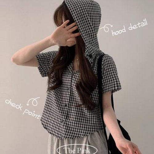 더핑크 / 폴르 체크 후드 스트링 반팔 셔츠