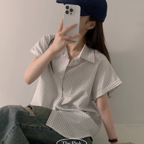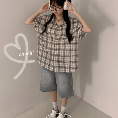 더핑크 / 틴아 오버핏 체크 시스루 반팔 셔츠