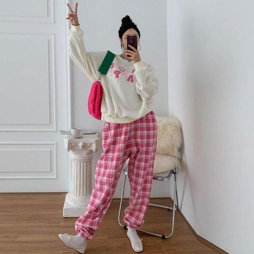 [셀러허브_여성트랜드패션]사랑스러운 맨투맨 체크바지 2종 조거 후리스