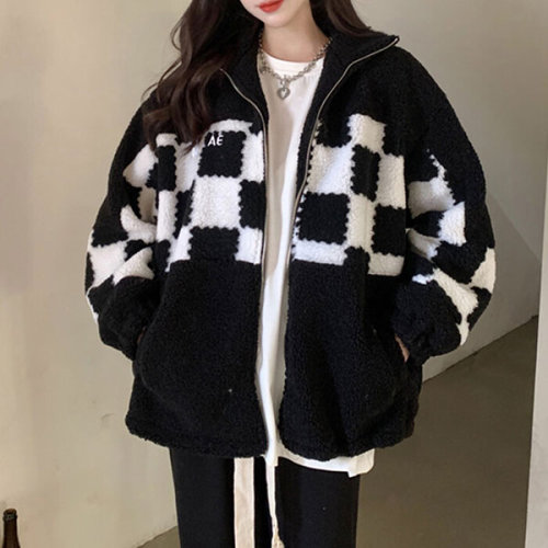 여성 겨울 기모 후리스 뽀글이 양털 퍼 안감 체크 폴라 플리스 집업 자켓