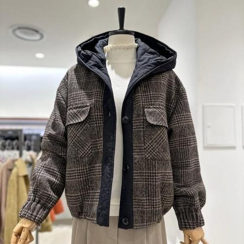 [라일리] Rly 여성 간절기 자켓 캐주얼 체크 후드 플리스 벨벳 코트