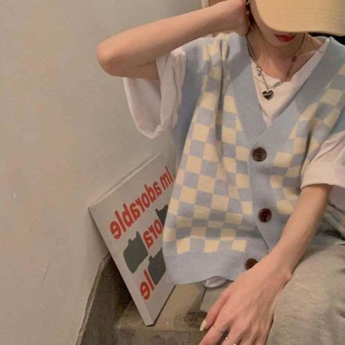 [셀럽하우스]여성 AFDK1249 봄 가을 체크 V넥 루즈핏 니트 조끼 니트베스트