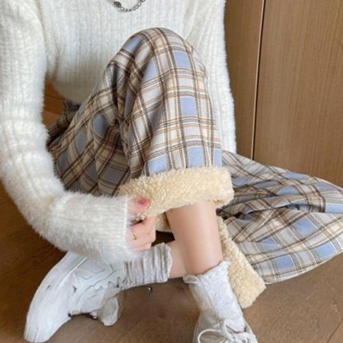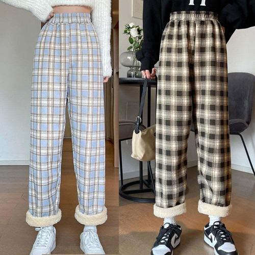 뽀글이 양털 기모팬츠 체크바지 밴딩바지 겨울 여자츄리닝 여성 와이드핏 일자