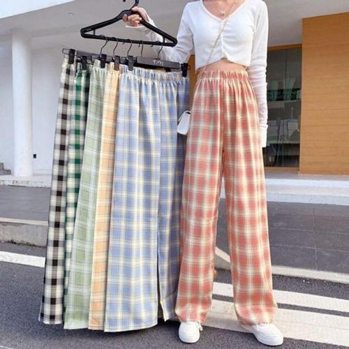 SELEAD 여성용 모직 체크 와이드 일자 슬랙스 바지 팬츠 모직 와이드 캐주얼 봄가을 바지 허리밴딩 삼색