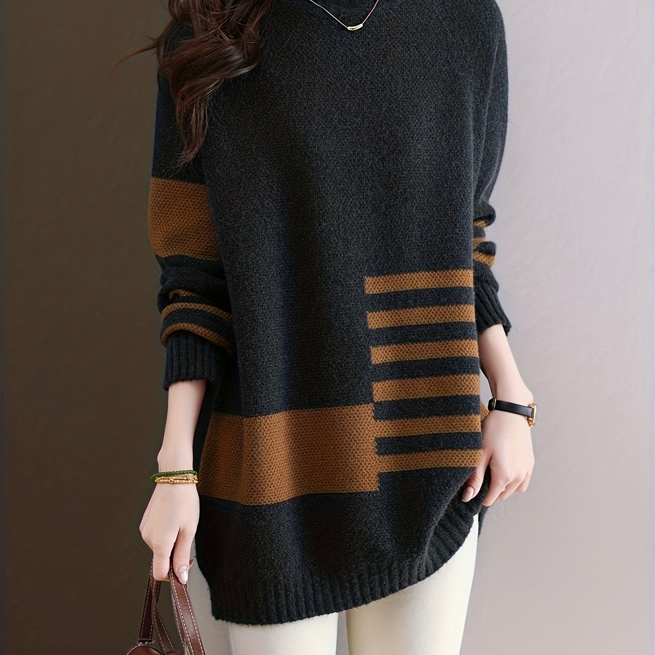 TEMU 여성용 미디 길이 하이넥 풀오버 스웨터, 2025년 가을/겨울 신상 한국 스타일, 루즈핏 컬러 블로킹 디자인, 패셔너블하고 활용도 높은 베이스 레이어 탑