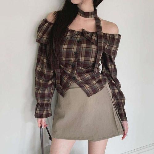 옷자락 / 여성 키치무드 초커넥 체크 언발 오프숄더 블라우스
