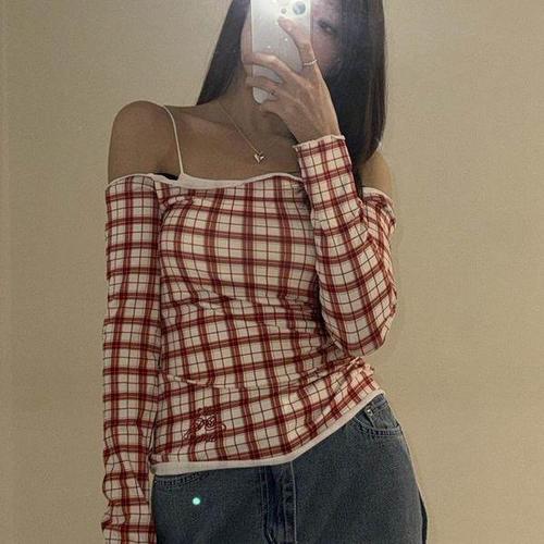 TIMEPURE 여성 봄가을 오프숄더 체크 티셔츠 레이어드