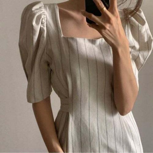 [셀럽하우스]세로스트라이프 MYOF4837 H라인 여름원피스 원피스 퍼프반팔 바