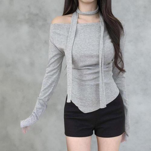 쪼예 초커 홀터 언발 슬림 긴팔 니트 티셔츠