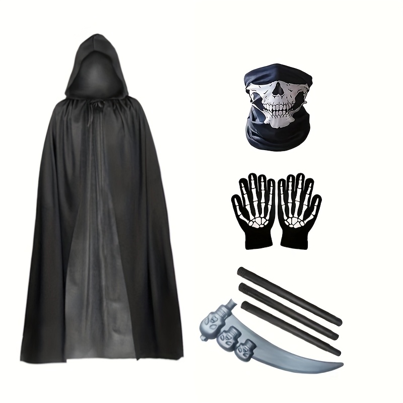 TEMU 4개 그림레이퍼 망토 세트, 할로윈 의상, 할로윈용 검은 후드 케이프, 해골 마스크, 낫, 그리고 해골 장갑 포함, 할로윈 장식, 코스프레 또는 카니발에 완벽, 배터리 없음