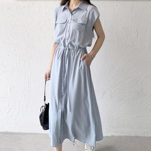[엄지척]더블 포켓 세미 민소매 카라 허리 스트랩 롱 원피스_19911187_667501