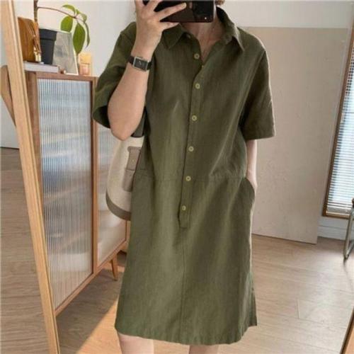 [셀럽하우스]에센셜 HJXL1855 카라 데일리 반팔 여성 클래식 셔츠 버튼 원피