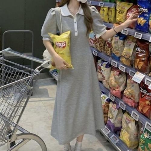 [엄지척]카라배색 셔링 퍼프 반팔 신축성 좋은 여성 롱 원피스_19911212_667501
