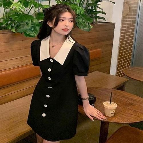 [엄지척]여성 블랙 여름 반팔 배색 카라 퍼프소매 미니 원피스_19910774_667501