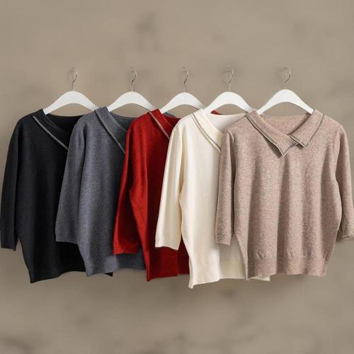 [신상오픈런]여성 언발란스 블링 큐빅 카라넥 가을 반팔 니트 티셔츠 레드
