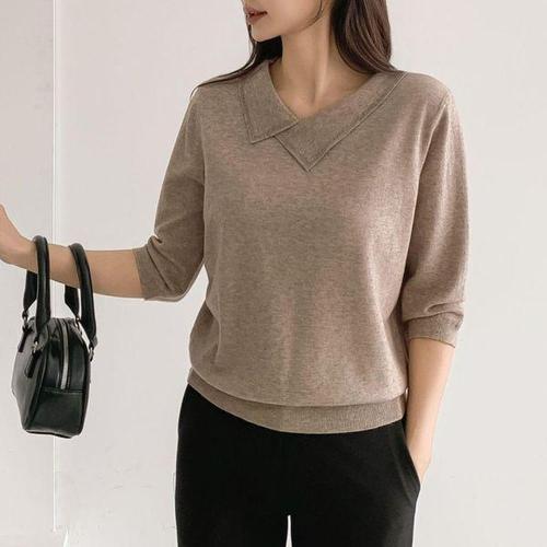 [샵앤]국산 여성 슬릿 카라넥 단가라 반팔 니트 티셔츠 21DS-WKN-4448-레드