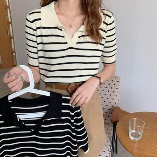 [엄지척]여성 스트라이프 여름 반팔티셔츠 카라 브이넥 반팔티_19612993_667501