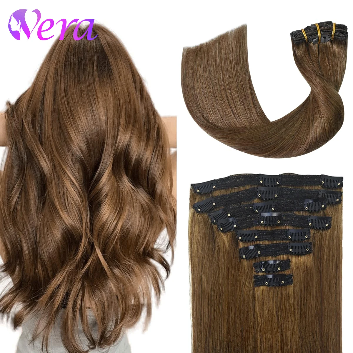 연한 갈색 헤어 익스텐션 클립 인 인모 120G 8개 클립 인 인모 익스텐션 스트레이트 # 6호 밤색 머리 연장