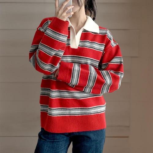[미라클세븐]여성 오버사이즈 컬러 블록 스트라이프 오픈 카라 레드 티셔츠