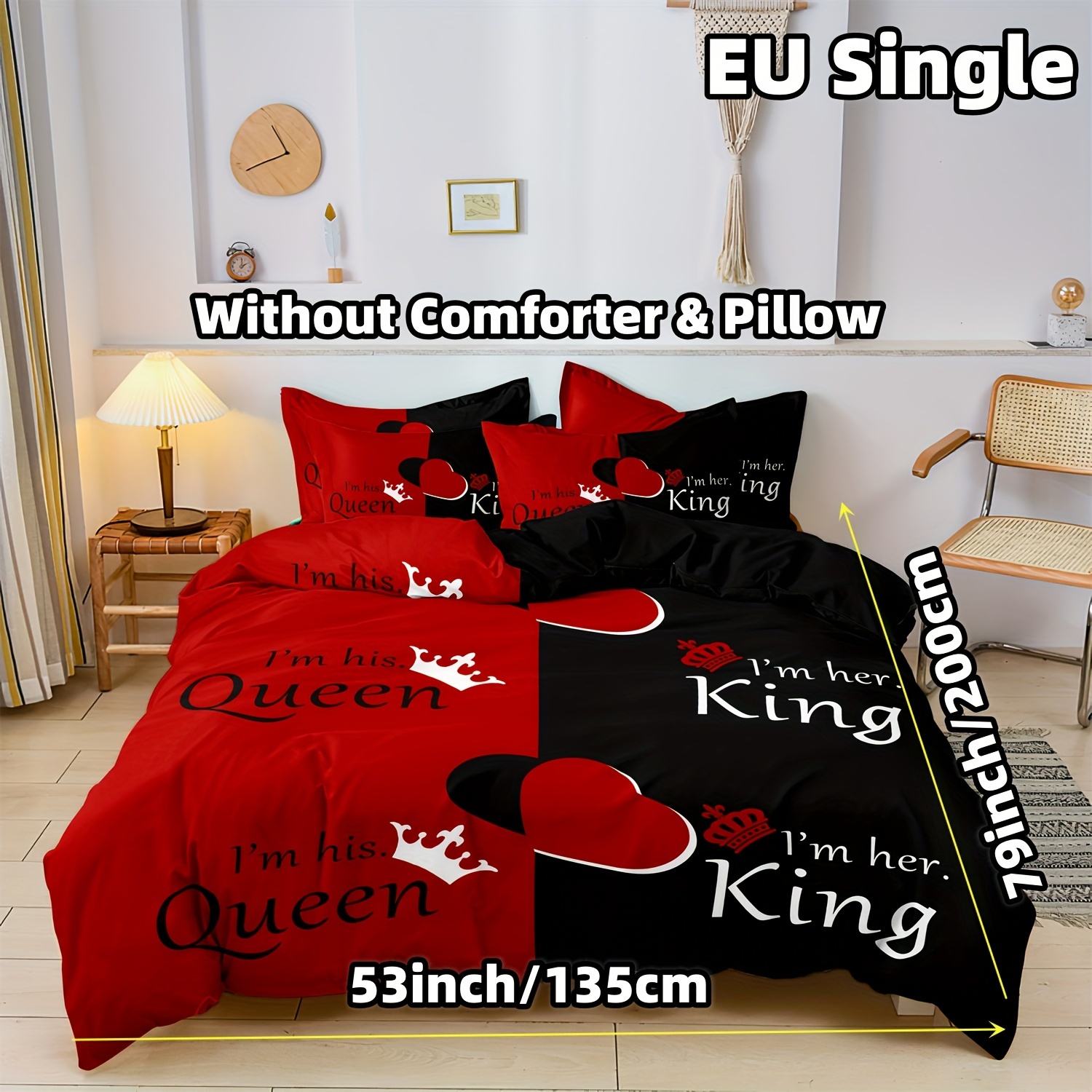 TEMU 다크 레드 & 블랙 색상의 퀸 & 킹 레터 패턴 프린트 침구 세트 (담요 커버 및 베갯잇 포함)
