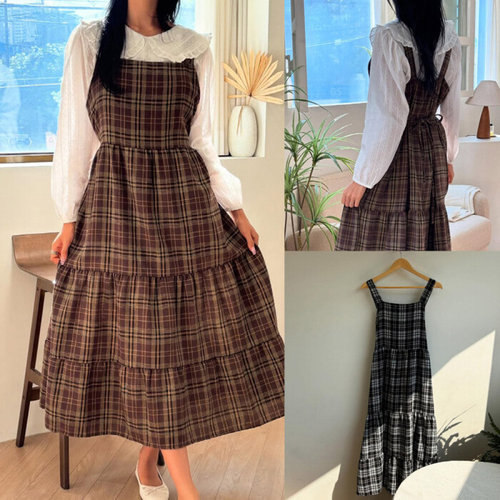 [옷자락]여성 롱 캉캉 체크 셔링 뷔스티에 원피스