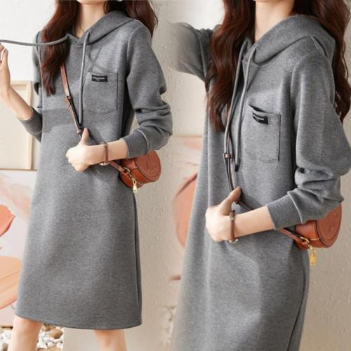 순면 후드 맨투맨 원피스 봄가을 여성용 심플 캐주얼 긴팔 티셔츠 원피스 데일리 편안한 미디 a라인 원피스