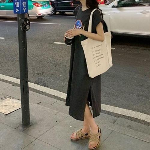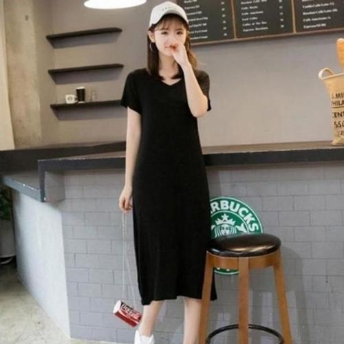 [엄지척]베이직 레터링 여성 밑단 트임 캐주얼 반팔 롱 원피스_19913495_667501