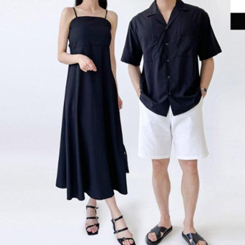 가비진 여성용 스모크 끈 롱 원피스 + 무지 카라 반팔셔츠 남녀 커플룩 시밀러룩 휴가룩 바캉스룩 세트 남여개별구매