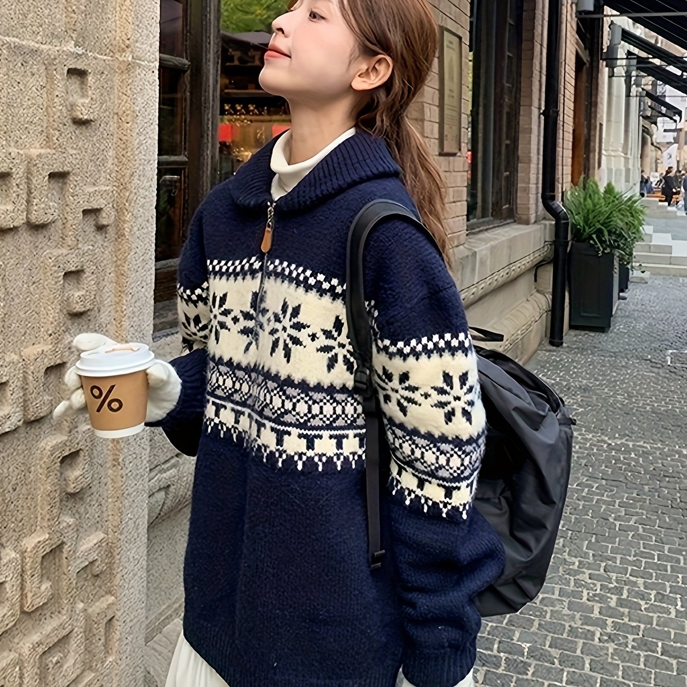 TEMU 빈티지 하이 칼라 스웨터 | 여성용 루즈핏 페어 아일 패턴 풀오버, 반 지퍼, 가을/겨울 컬렉션|빈티지