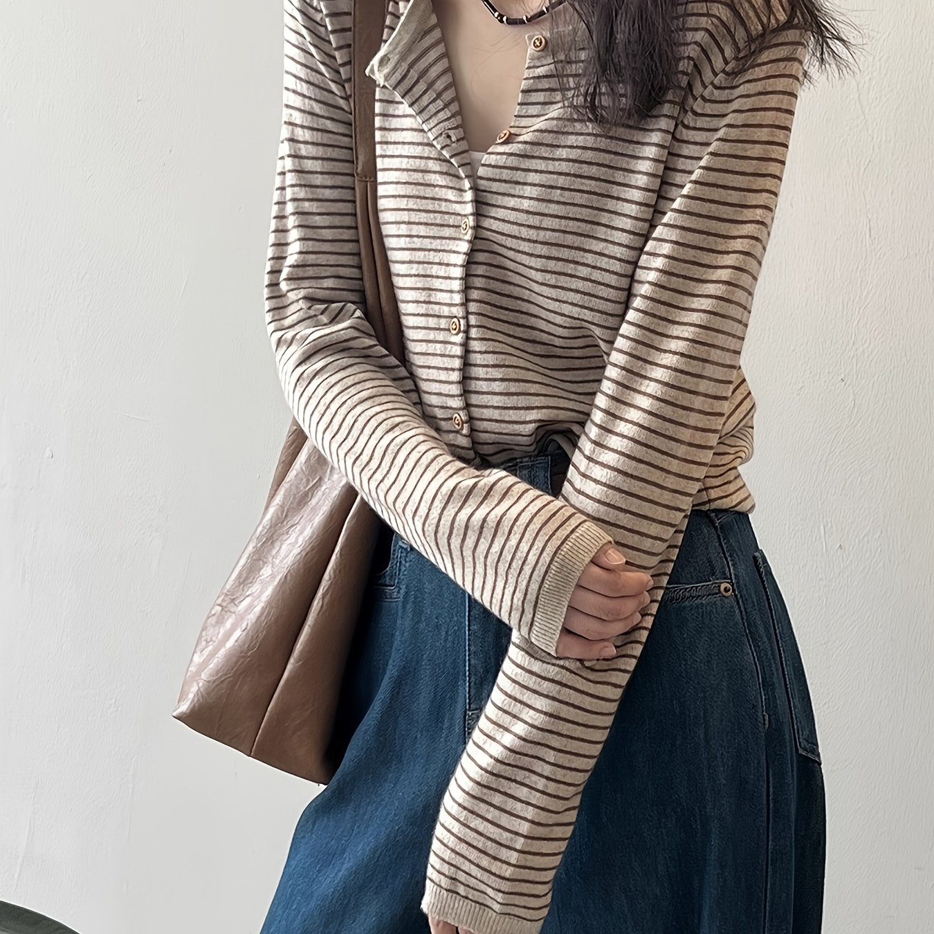 TEMU 여성용 소프트 & 클래식 가디건 - 긴 소매, 단추 디자인, 라운드 넥, 가벼운 봄/가을 아우터웨어, 브라운 & 화이트 수직 줄무늬, 캐주얼 스타일, 캐주얼 웨어 카디건