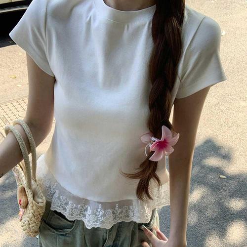 여성 데이트 룩 티셔츠 코디 밑단 레이스 라운드넥 WFKOCHO