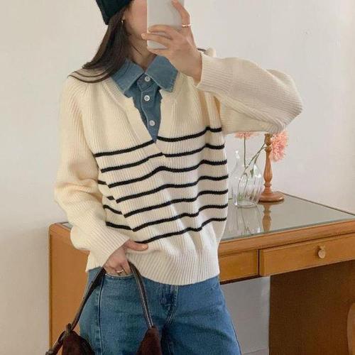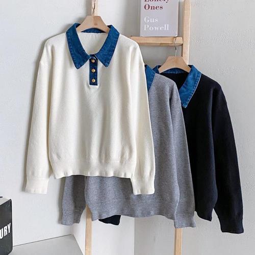 [다잇템]여성 코디 버튼 카라넥 진 스웨터 키치무드
