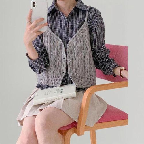 [다잇템]여성 코르셋 패턴 격자 셔츠와 스웨터 세트
