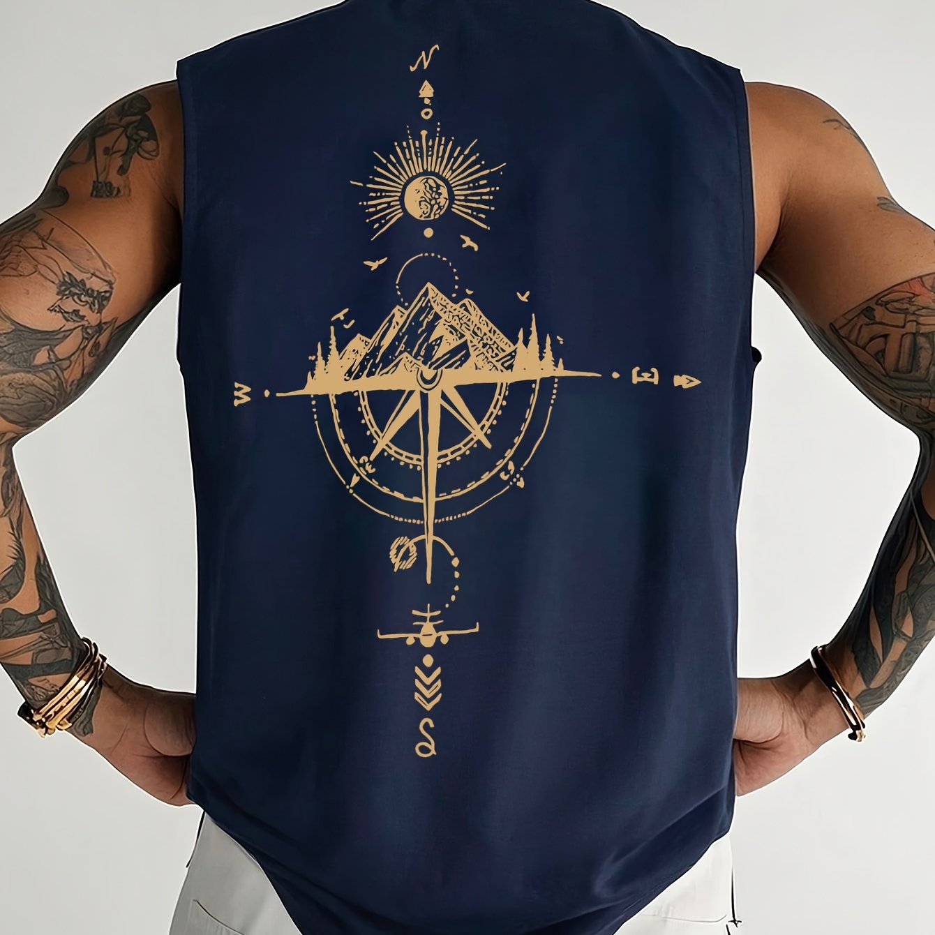 TEMU 남성용 캐주얼 스포츠 탱크 탑, 가볍고 통기성 좋은 니트 원단으로 제작되었으며, 나침반과 산 정상 디자인, 라운드넥 및 민소매 스타일로 제작되었으며, 헬스장 및 캐주얼 웨어에 적합합니다.