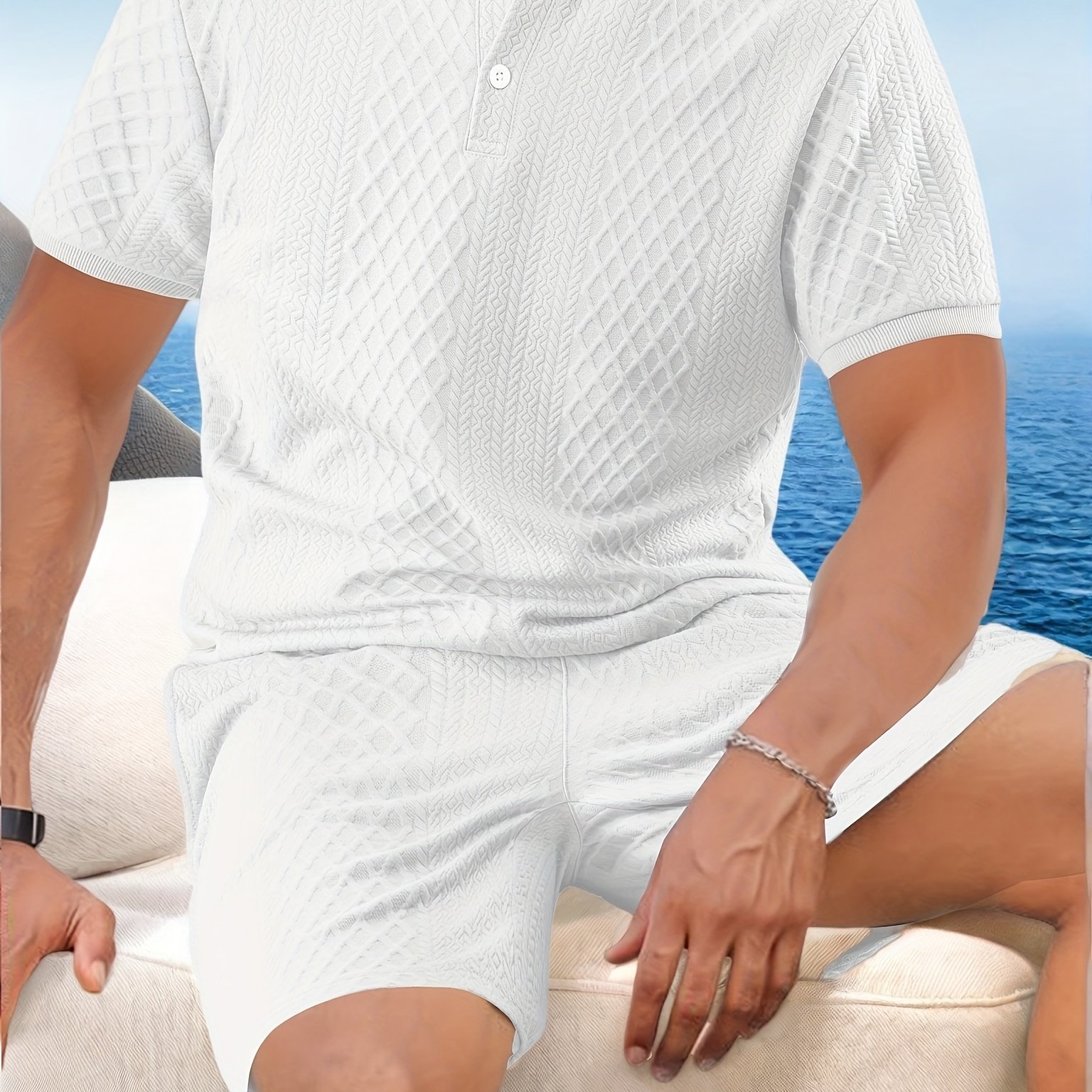 TEMU 투피스 세트, 남성 여름 의상, 자카드, 라운드넥 반팔, 드로스트링 반바지, 고중량 원단, 캐주얼 세트.