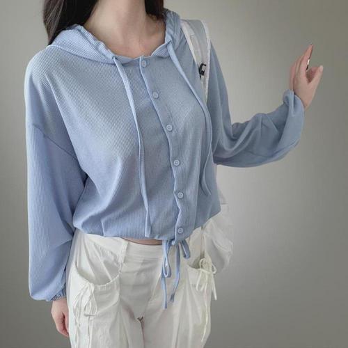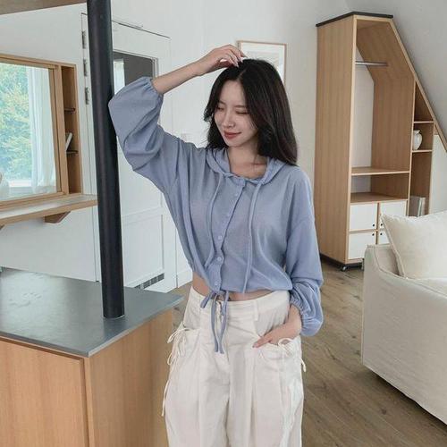 [신상오픈런]여성용 쿨링 크롭 후드 긴팔 가디건 스트링 디자인