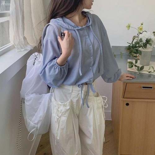 [옷자락] 여성 캐주얼 쿨링 후드 스트링 크롭 긴팔 가디건