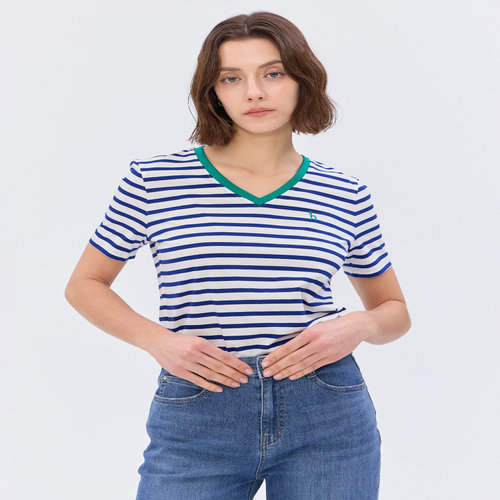 헤지스 여성 [스테디셀러][면100]다크블루 스트라이프 에어로쿨 브이넥 반소매 티셔츠 (WSTS5B313B3)