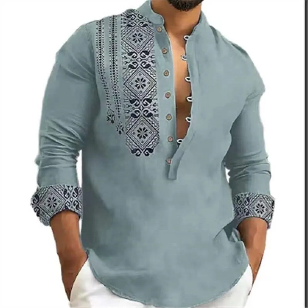 2025 패션 신상 7버튼 남성 긴팔 셔츠 버튼다운 셔츠 루즈핏 헨리넥 V넥 비치탑 남성 무슬림 의류