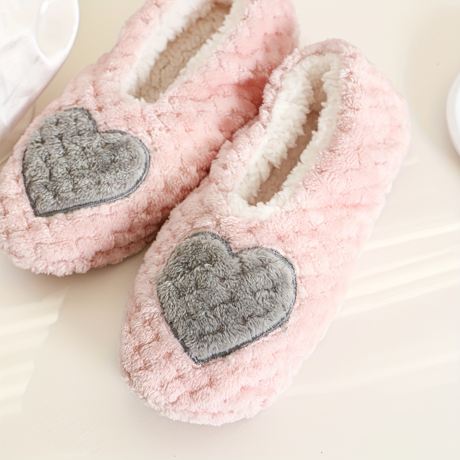 TEMU 여성용 겨울철 가정용 두꺼운 슬리퍼. 스타일리시하고 우아한 랜덤 하트 패턴이 특징이며, 갑피에 작은 폼폼 장식이 있으며, 패브릭 미끄럼 방지 밑창이 있습니다. 여성 신발|여성슬리퍼