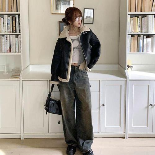 [옷자락] 여성 루즈핏 페이크 스웨이드 양털 크롭 무스탕