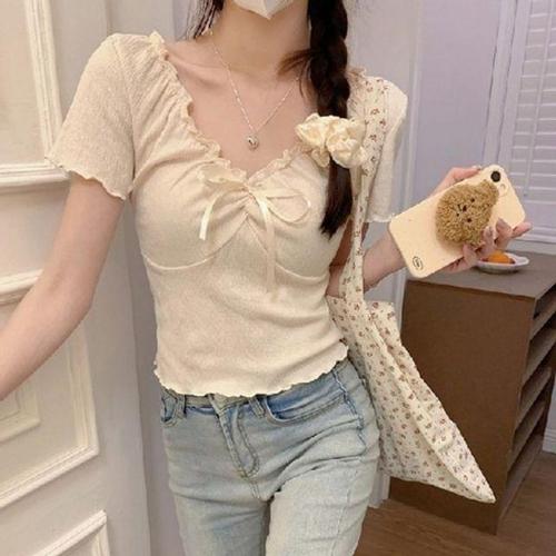 달콤한 여성 셔츠 한국 니트 턴다운 칼라 시크한 반팔 여성 블라우스 여름 레트로 슬림 올매치 여성 크롭탑