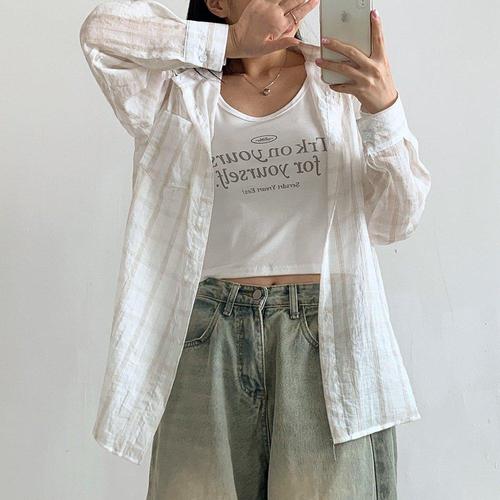 [옷자락] 여성 레터링 크롭탑 시스루 체크 셔츠 세트