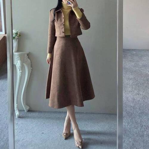 [엘린무드](세트) 버나드 스웨이드 카라 크롭 자켓 A라인 훌 롱 스커트 투피스(2COLOR)
