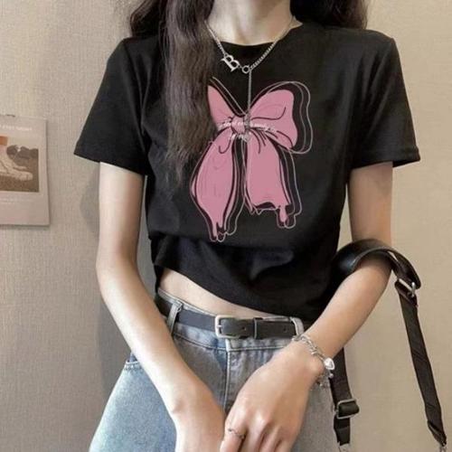 [엄지척]여자 리본 프린팅 반팔티셔츠 여름 반팔티 세미크롭_19614702_667501