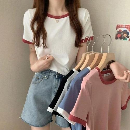 [엄지척]여성 여름 힙한 반팔티 배색라인 세미크롭 반팔티셔츠_19610064_667501