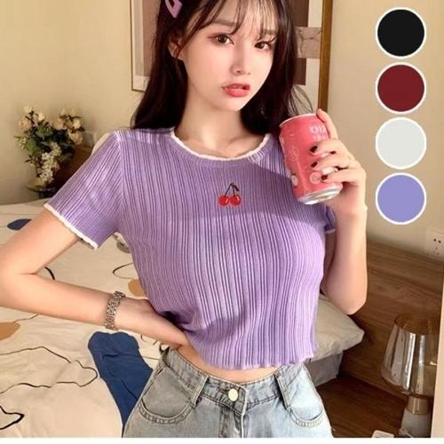 [엄지척]여성 큐티 체리 자수 예쁜 여름 반크롭 반팔티셔츠_19614145_667501