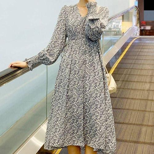 [BZJII170_4B]대학 여대생 개강 브이넥 꽃 무릎 긴팔원피스